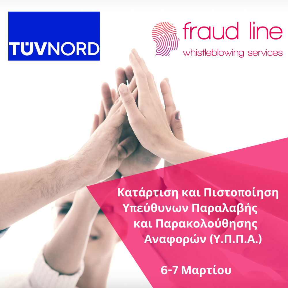 Η Fraud Line, σε συνεργασία με την TÜV Nord και την Telecom Experts, παρουσιάζει ένα εξειδικευμένο διήμερο εκπαιδευτικό σεμινάριο για την υποβολή αναφορών παραβιάσεων του Ενωσιακού Δικαίου (Ν. 4990/2022) και εκπαίδευση για τον ρόλο και τις αρμοδιότητες των Υπεύθυνων Παραλαβής και Παρακολούθησης Αναφορών (Υ.Π.Π.Α.).